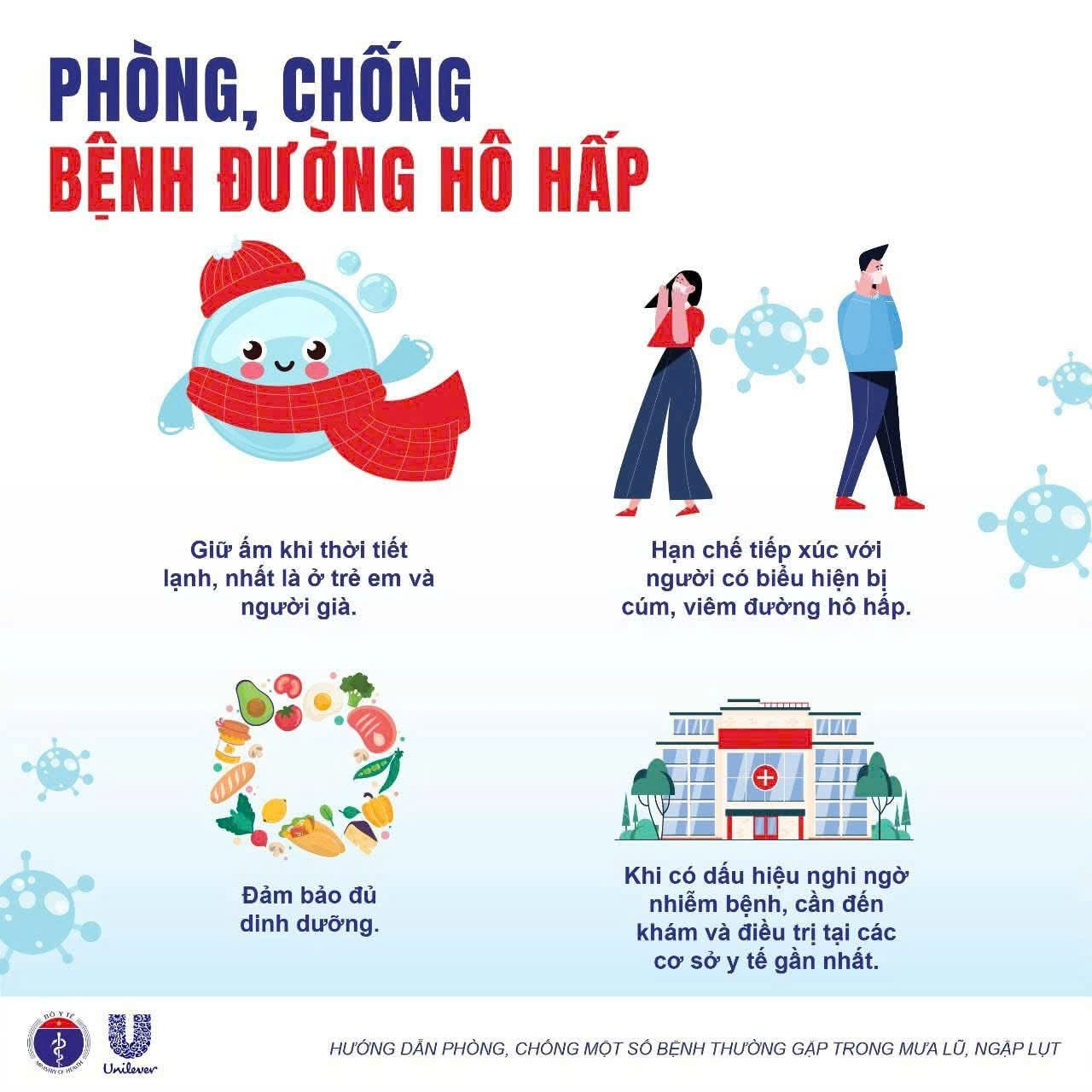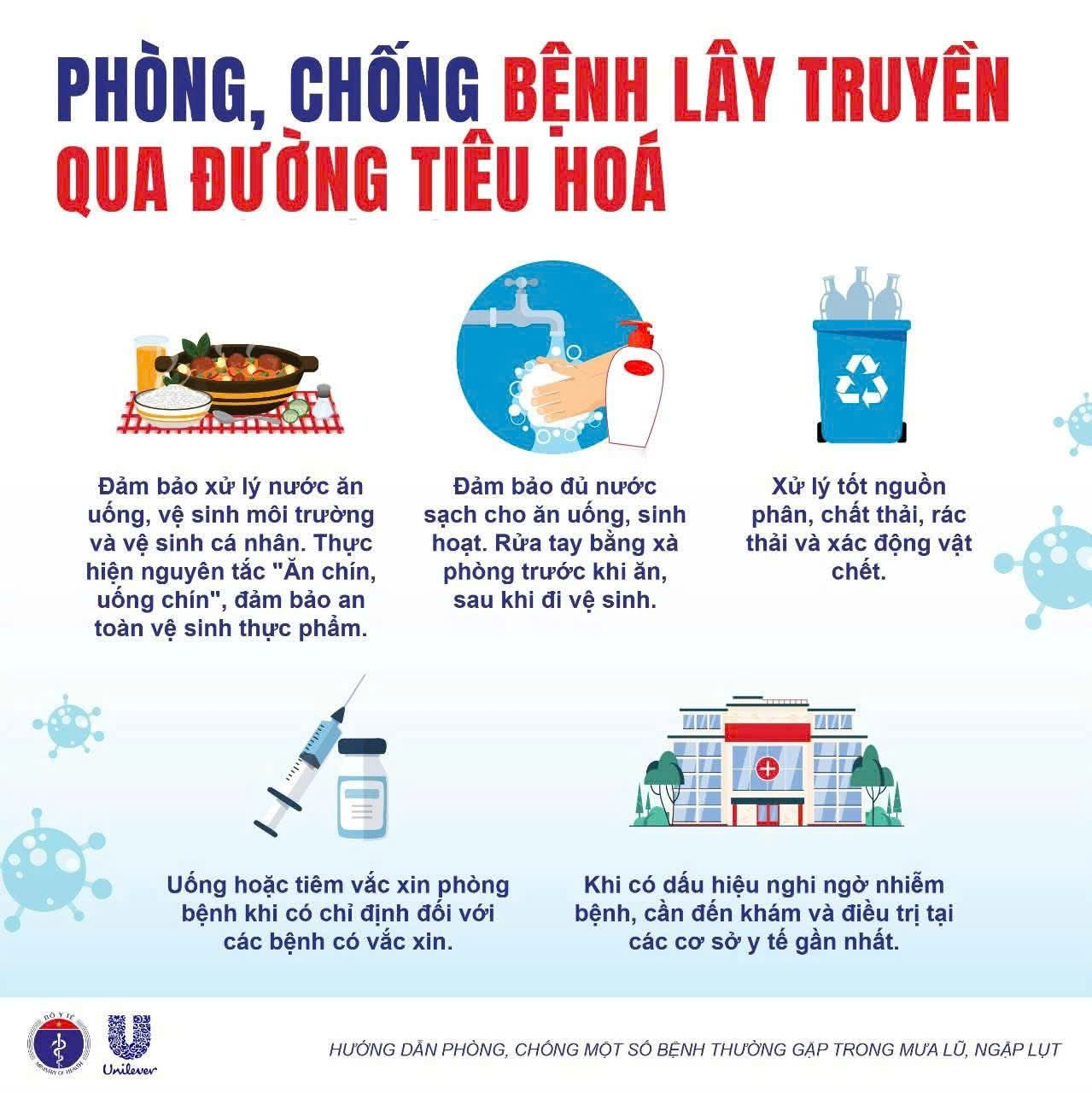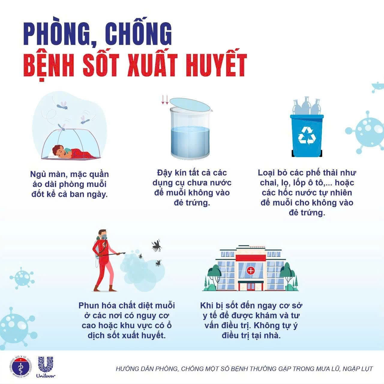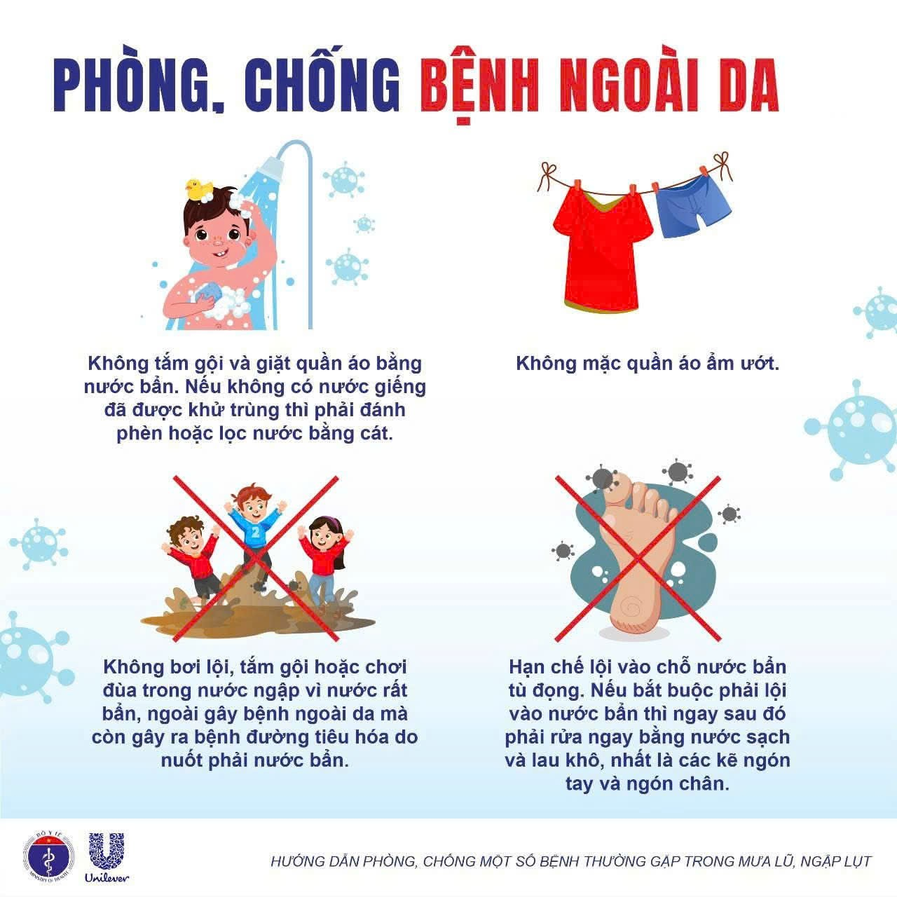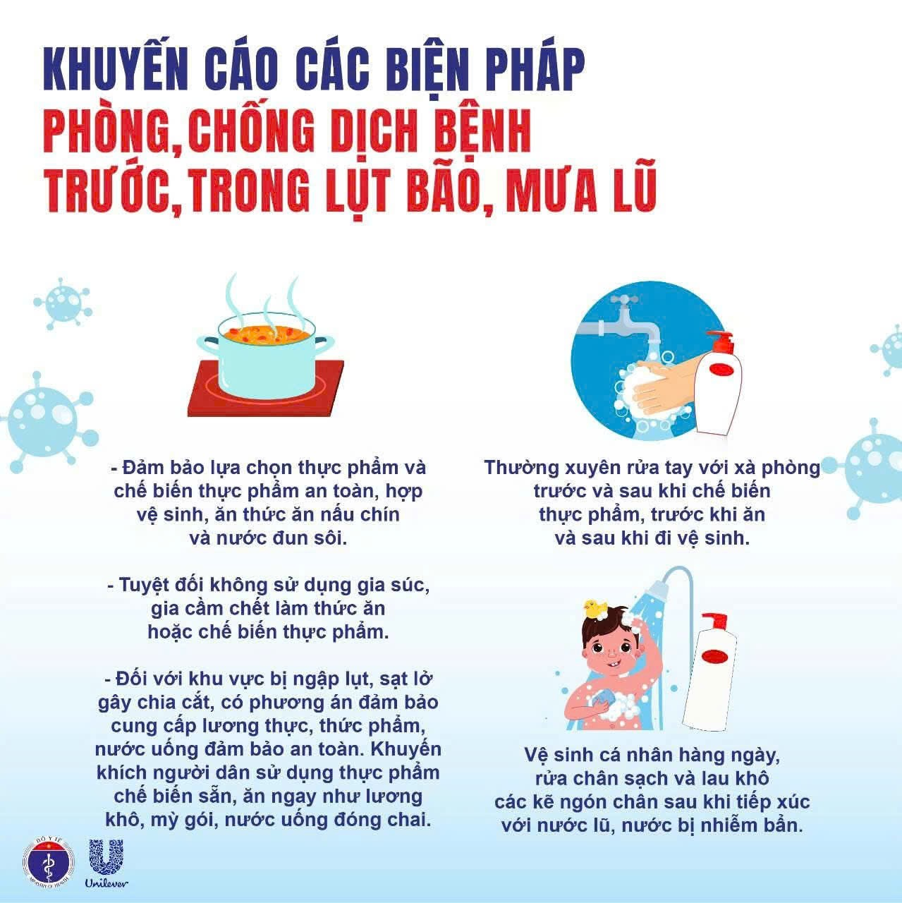 📢 BẢO VỆ SỨC KHỎE GIA ĐÌNH TRONG MÙA MƯA BÃO – CHA MẸ CẦN BIẾT! ⛈️🧼✅✅Bộ Y tế khuyến cáo các biện pháp phòng, chống dịch bệnh thường gặp trong mùa mưa lũ – đặc biệt quan trọng với trẻ nhỏ và người già:🌡️ 1. Phòng bệnh đường hô hấp– Giữ ấm cho trẻ và người lớn tuổi– Hạn chế tiếp xúc người ho, sốt, cảm cúm– Ăn uống đủ chất, tăng sức đề kháng– Khi có dấu hiệu bệnh cần đi khám ngay🦟 2. Phòng sốt xuất huyết– Ngủ màn, mặc quần áo dài tay– Đậy kín đồ chứa nước, loại bỏ các phế thải– Phun thuốc diệt muỗi tại nơi có nguy cơ cao– Sốt cao phải đến cơ sở y tế, không tự điều trị🧴 3. Giữ vệ sinh cá nhân và thực phẩm– Ăn chín, uống sôi, rửa tay sạch– Không ăn thịt gia súc, gia cầm chết– Tắm rửa, lau khô người sau khi lội nước bẩn– Dự trữ thực phẩm khô, nước đóng chai🧫 4. Phòng bệnh tiêu hóa, ngoài da, đau mắt đỏ– Không tắm rửa bằng nước bẩn– Không cho trẻ chơi, lội nước ngập– Mặc đồ khô, sạch, tránh ẩm ướt– Không dùng chung khăn, chậu rửa mặt– Dùng thuốc nhỏ mắt, vệ sinh tay sạch sẽ– Tiêm vắc xin theo khuyến cáo🚰 5. Xử lý môi trường sau lũ– Vệ sinh nhà cửa, khử trùng nước giếng, bể chứa– Diệt loăng quăng, muỗi– Xử lý xác động vật đúng cách– Có dấu hiệu nghi bệnh, đến trạm y tế gần nhất👉👉Cha mẹ hãy lưu ý và hướng dẫn trẻ thực hiện đúng để bảo vệ sức khỏe cả nhà trong mùa mưa bão.