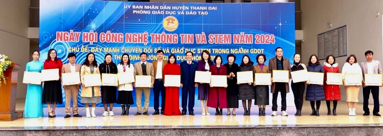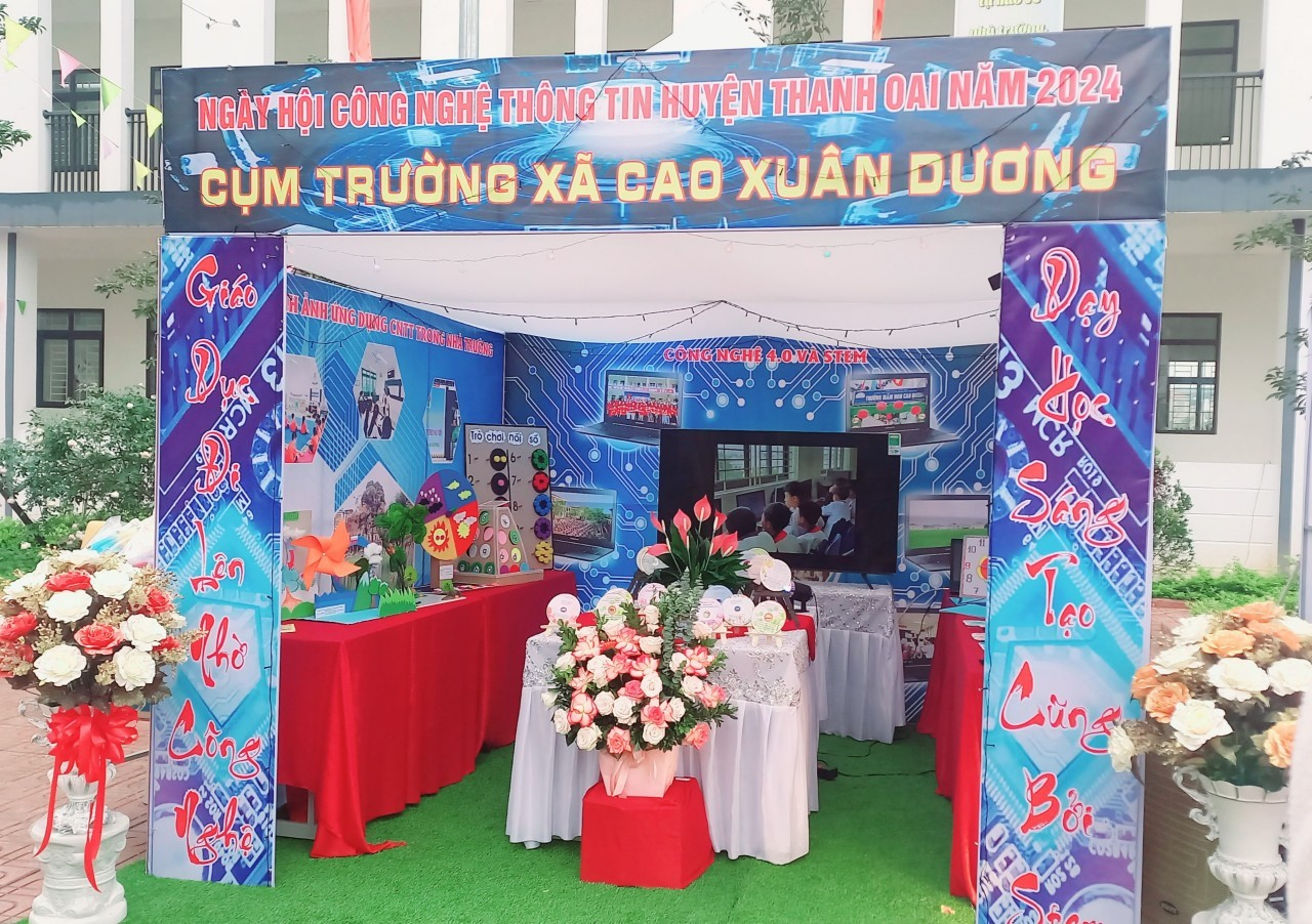 BÙNG NỔ NGÀY HỘI CÔNG NGHỆ THÔNG TIN VÀ STEM NGÀNH GIÁO DỤC VÀ ĐÀO TẠO HUYỆN THANH OAI NĂM 2024 Chuơng trình được phòng Giáo dục và Đào tạo huyện Thanh Oai tổ chức - Ngày hội CNTT và Stem:Thời gian: từ 7h00 - 17h00, ngày 25/02/2024 (Chủ Nhật);Địa điểm: trường THCS Bình Minh Đã có rất nhiều mô hình, sản phẩm sáng tạo sẽ được BTC và 03 cấp MN, Tiểu học, THCS thực hiện với 20 gian trưng bày, hướng dẫn thử nghiệm, trải nghiệm. Theo ghi nhận từ Ban Tổ chức, Ngày hội CNTT năm nay tập trung vào chất lượng và được thể hiện rõ nét trong kết quả cuộc thi Bài giảng điện tử E-learning và các sản phẩm hoàn thành từ hoạt động giáo dục STEM tại các nhà trường trong học kỳ I năm học 2023 - 2024. Ngày hội CNTT đã cho thấy vai trò quan trọng của CNTT trong việc nâng cao hiệu quả của các hoạt động giáo dục và thúc đẩy giáo dục mở. CNTT giúp người dạy và học cập nhật được kiến thức đa dạng và thường xuyên, tạo ra không gian và thời gian học linh hoạt. Chúc mừng gian hàng của xã Cao Xuân Dương- Đạt giải 3 toàn đoàn.