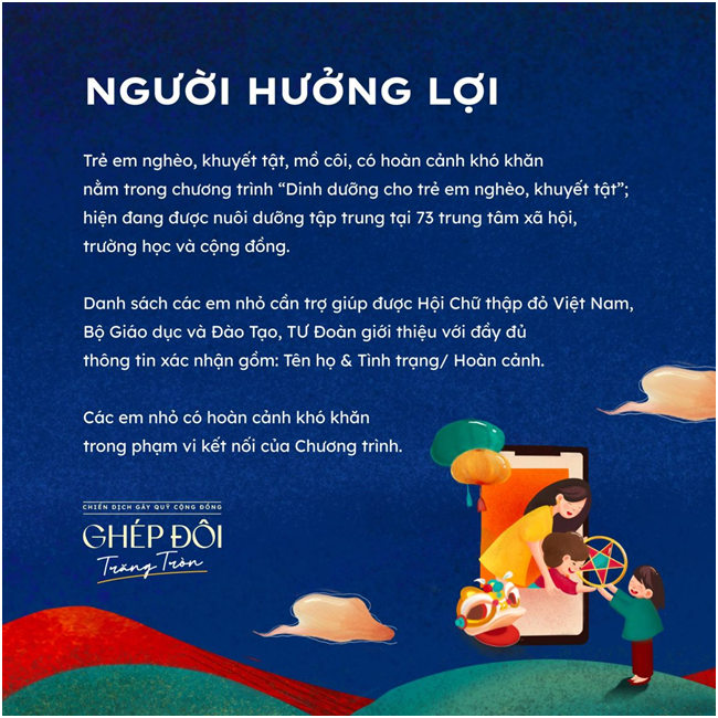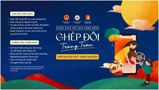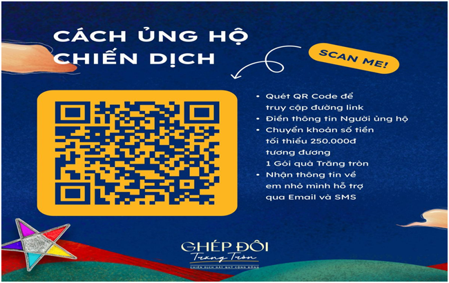 - Ủng hộ qua nền tảng App Thiện nguyện: https://thiennguyen.app/donate-target/1700091601344270336 Bước 2: Điền thông tin cá nhân và ủng hộ tối thiểu 250.000đ qua các hình thức chuyển khoản của nền tảng. Bước 3: Người ủng hộ nhận thông báo cảm ơn “Ba/Mẹ trăng tròn” và xác nhận “ghép đôi thành công” với “Em nhỏ trăng khuyết” cùng đầy đủ thông tin liên hệ (Tên-Tuổi-Địa chỉ). Bước 4: Người ủng hộ nhận thông báo “ghép đôi hoàn thành” khi “Gói quà trăng tròn” từ Chương trình được chuyển đến tay em nhỏ thành công. *Thời gian tham gia và tiếp nhận ủng hộ: Trước 29/9/2023 tròn” cũng là một trong nhiều hoạt động thiết thực mà Hội Chữ Thập đỏ Việt Nam hỗ trợ cho các em nhỏ trong chương trình “Dinh dưỡng cho trẻ em nghèo, khuyết tật” đã triển khai trên khắp cả nước từ đầu năm 2023 đến nay. Chiến dịch được tổ chức bởi Trung ương Hội Chữ thập đỏ Việt Nam phối hợp cùng Bộ Giáo dục và Đào tạo với sự đồng hành từ một số đối tác của Hội Chữ Thập đỏ Việt Nam, các điểm trường tại Thành phố Hà Nội, Hải Phòng, Đà Nẵng, Thành phố Hồ Chí Minh, Cần Thơ và tỉnh Bình Dương. Thông tin tiếp nhận ủng hộ được cập nhật minh bạch trên các nền tảng gây quỹ cũng như các hình thức xác nhận từ Chiến dịch. Ngoài ra, các hoạt động tặng quà thực tế cũng như hiệu quả triển khai Chiến dịch sẽ được cập nhật trên các phương tiện thông tin của Trung ương Hội Chữ thập đỏ Việt Nam. Trường Mầm non Cao Dương rất mong nhận được sự ủng hộ, cổ vũ từ các thầy cô giáo, các em học sinh cũng như quý vị phụ huynh khi tham gia Chiến dịch “Ghép đôi trăng tròn”. Nhà trường mong muốn cùng với sự chung tay, ủng hộ của cộng đồng người Việt nhân ái, sẽ không chỉ giúp đỡ các em nhỏ khó khăn, mà còn tận dụng sức mạnh của công nghệ góp phần minh bạch hóa hoạt động xã hội, giúp kết nối chặt chẽ và lan tỏa mạnh mẽ hơn tinh thần tương thân tương ái nhân dịp Tết Trung thu.