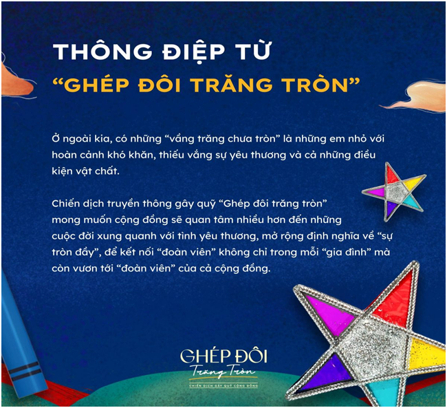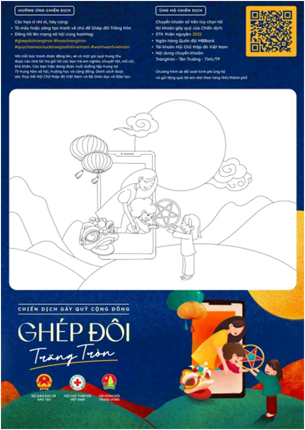 Các em học sinh trường Mầm non Cao Dương có thể cộng hưởng truyền thông cho chiến dịch bằng hoạt động tô tranh, vẽ tranh hay sáng tạo các nội dung khác với chủ đề “Ghép đôi trăng tròn, Trung thu đoàn viên, Trung thu 4.0…” rồi đăng lên mạng xã hội với hashtag #ghepdoitrangtron. Với mỗi hashtag được ghi nhận, nhà tài trợ doanh nghiệp sẽ tặng một món quà đến các em nhỏ còn khó khăn.