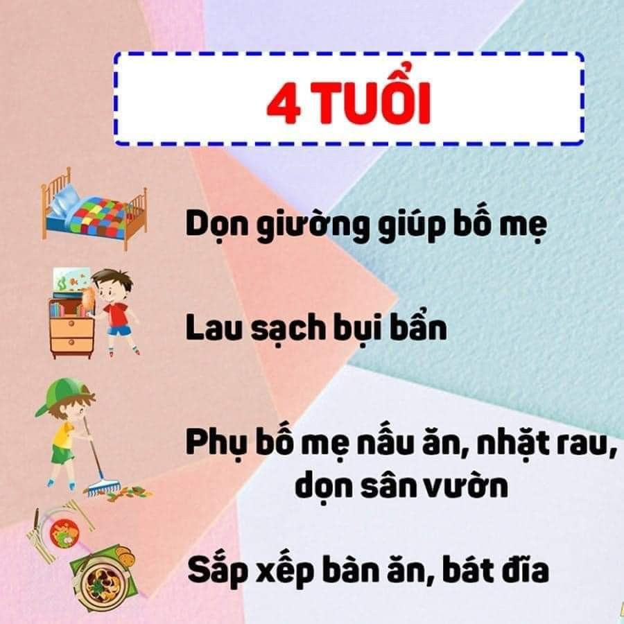 Càng dạy sớm, việc con làm càng nhanh chóng trở thành thói quen. Các con nên được bắt đầu với những nhiệm vụ khả thi đơn giản như bỏ rác vào thùng, đi chợ cùng mẹ, tự phục vụ bản thân tham gia dọn dẹp nhà như cất đồ chơi đúng chỗ...