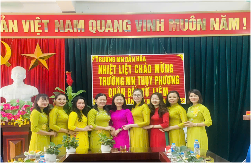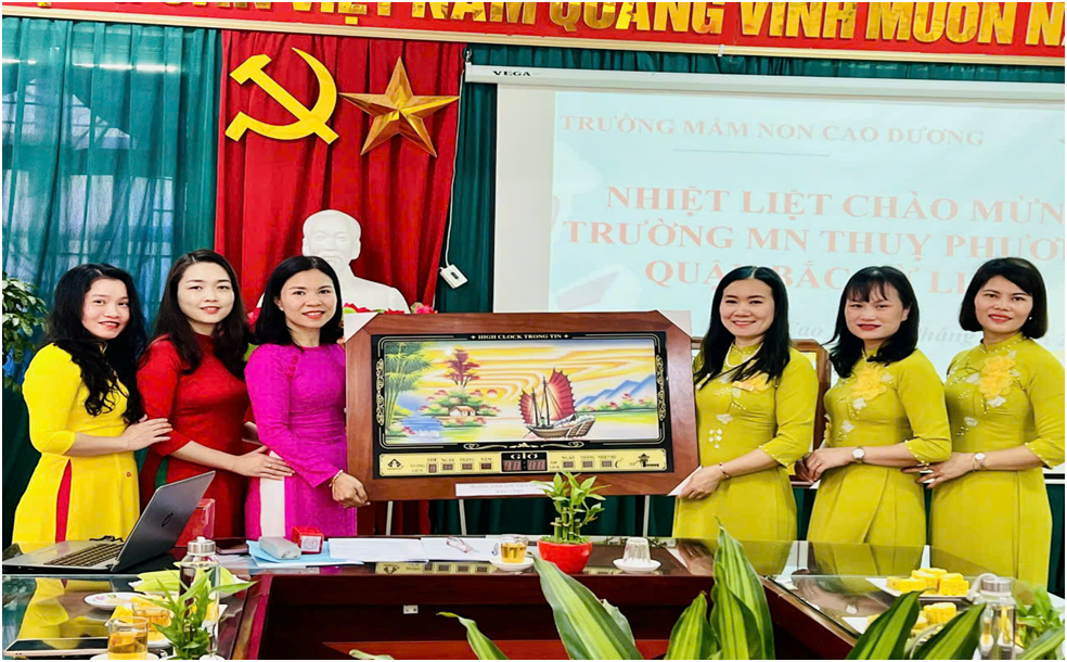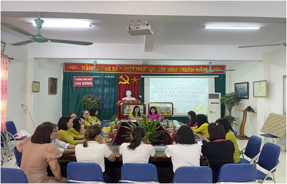 Ảnh: Gặp gỡ giao lưu 3 nhà trường 3.Điểm nổi bật trong tổ chức phong trào Đó thực sự là những trao đổi, góp ý rất bổ ích và quý báu về chuyên môn nghiệp vụ cho mỗi cán bộ, giáo viên tham gia buổi giao lưu.Nhằm nâng cao chất lượng giáo dục, thu hẹp khoảng cách giáo dục giữa các trường quận nội thành với các trường của huyện ngoại thành. 4.Đánh giá chung Hoạt động thiết thực này đã tạo nên mối quan hệ đoàn kết, gắn bó giữa trường MN Cao Dương, MN Dân Hoà, MN Thuỵ Phương, cùng thực hiện và giúp đỡ lẫn nhau phát huy sức mạnh tổng hợp, tạo điều kiện cho nhau hoàn thành tốt chức năng, nhiệm vụ chính trị của mình, góp phần xây dựng môi trường học tập hiệu quả, lành mạnh. Sau hai năm triển khai, phong trào đã huy động đông đảo giáo viên tham gia, thể hiện trách nhiệm tình yêu với các con, đem đến nhiều ý nghĩa thiết thực, nâng cao chất lượng giáo dục toàn diện, từng bước thu hẹp khoảng cách chất lượng giáo dục giữa hai nhà trường, có ảnh hưởng sâu rộng và ngày càng có giá trị lan tỏa. III.Phương hướng thực hiện phong trào trong thời gian tới Ba nhà trường tiếp tục thực hiện có hiệu quả triển khai các hoạt động trong Biên bản ghi nhớ và Kế hoạch. IV.Kiến nghị đề xuất Không Trên đây là Kết quả thực hiện phong trào “ Nhà trường cùng chung tay phát triển- Thầy cô cùng sẻ chia trách nhiệm” giai đoạn 2022-2025 của trường Mầm non Cao Dương.